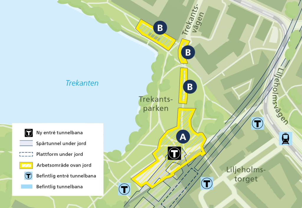 Arbetsområdena i Trekantsparken ska användas under hela byggtiden för den nya tunnelbanelinjen. Entrén mot Trekanten och trapporna från Liljeholmstorget planeras att stängas kring årsskiftet 2026/2027 och öppnar igen när arbetena är avslutade.